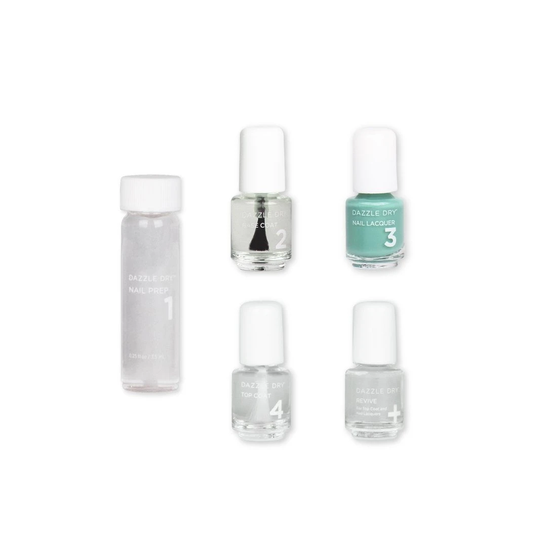 Includes: Nail Prep (.25 fl oz/ 7.5ml), Base Coat (.17 fl oz/ 5 ml), Nail Lacquer (.17 fl oz/ 5 ml), Top Coat (.17 fl oz/ 5 ml), Revive (.17 fl oz/ 5 ml)