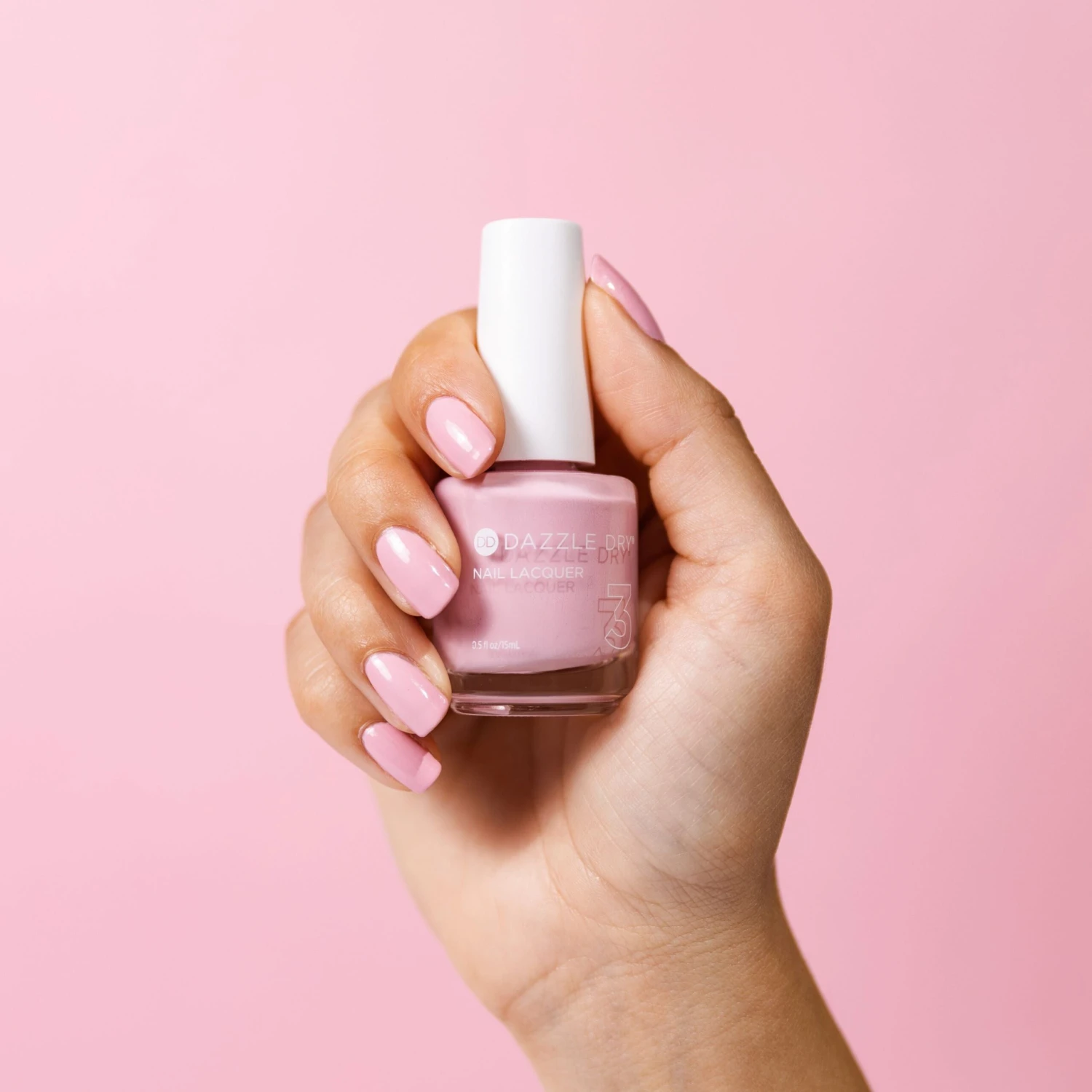 A muted bubble gum pink nail lacquer with a creamy finish.